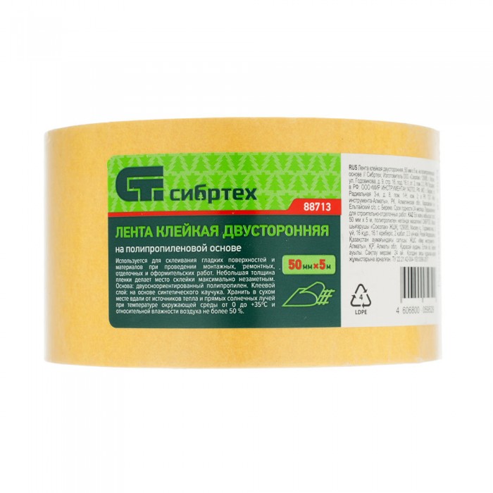 Лента клейкая двусторонняя, 50 мм х 5 м, на полипропиленовой основе Сибртех (88713)
