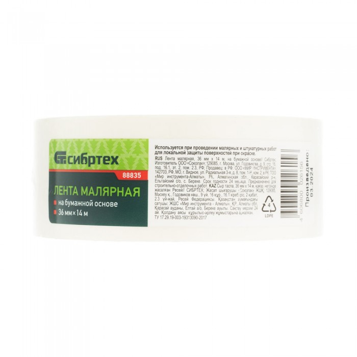Лента малярная, 36 мм х 14 м, на бумажной основе Сибртех (88835)
