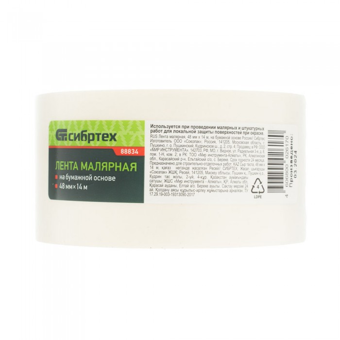 Лента малярная, 48 мм х 14 м, на бумажной основе Сибртех (88834)