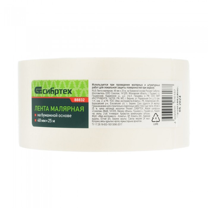 Лента малярная, 48 мм х 25 м, на бумажной основе Сибртех (88832)