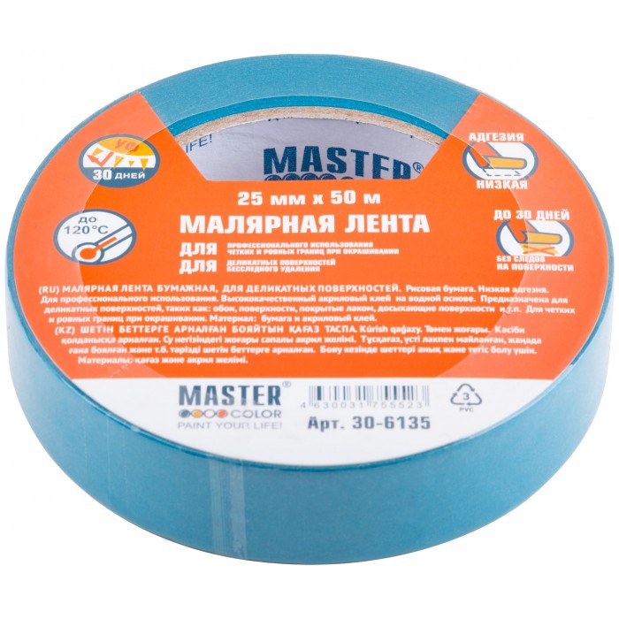 Малярная лента бумажная, сверхтонкая, для деликатных поверхностей, низкая адгезия. Термостойкость до 120°C. УФ стойкость до 30 дней. Высококачественный акриловый клей на водной основе. Предназначена для деликатных поверхностей, таких как: обои, поверхности, покрытые лаком, cвежеокраженные поверхности и т.п. Для четких и ровных границ при окрашивании.