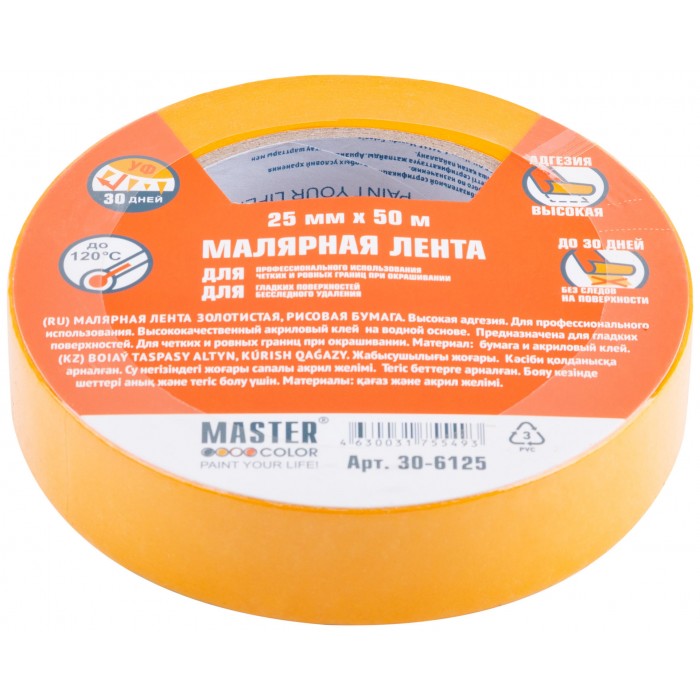 Лента малярная золотистая, рисовая бумага, термостойк. до 120°C, УФ-стойкость до 30 дней, 25 мм х 50 м (30-6125)
