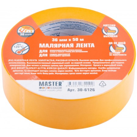 Лента малярная золотистая, рисовая бумага, термостойк. до 120°C, УФ-стойкость до 30 дней, 36 мм х 50 м (30-6126)