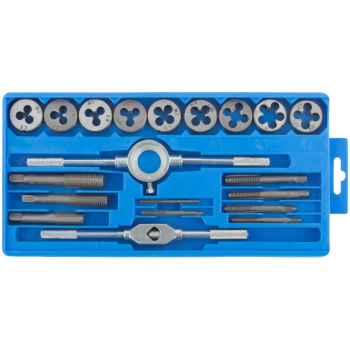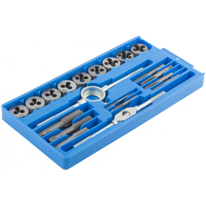Для труб из цветных металлов при мелком бытовом ремонте. В наборе:метчикодержатель, плашкодержатель, 9 метчиков и 9 плашек. Материал: инструментальная сталь. Упаковка: пластиковая коробка.
