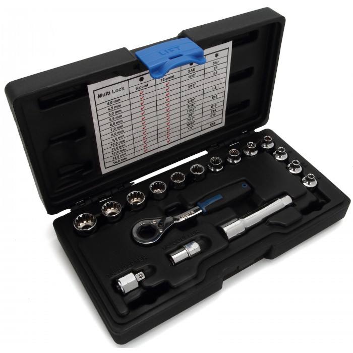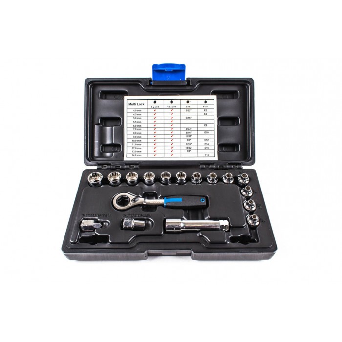 Кроме того, рабочий профиль головок Spline повышает функциональность набора, такой профиль позволяет работать как с обычным шестигранным крепежом, так и с 12-гранным, TORX, а также им можно крутить крепеж дюймовых размеров. В наборе есть и переходник, установив который в трещотку, можно работать головками с обычным квадратным приводом размером 1/4", а также адаптер под биты с хвостовиком 1/4". Удлинитель на 75 мм для головок входящих в набор, позволит работать с глубоко посаженным крепежом.