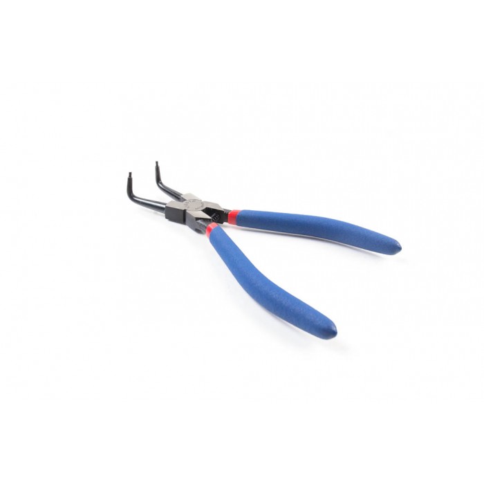 Съемник внутренних стопорных колец, загнутый Licota APT-38002B из хром-ванадиевой стали и ручками из эргономичного нескользящего полимера. Съемник работает на сжим. Длина инструмента - 180 мм.