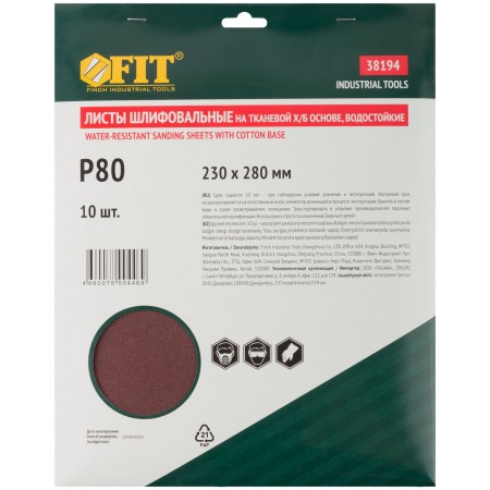 Листы шлифовальные водостойкие на тканевой основе, алюминий-оксидные, Профи 230х280 мм, 10 шт. Р 80 (38194)