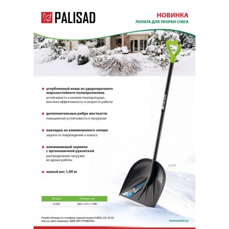 Лопата для уборки снега пластиковая, 400х417х1390 мм, алюминиевый черенок Palisad (61395)