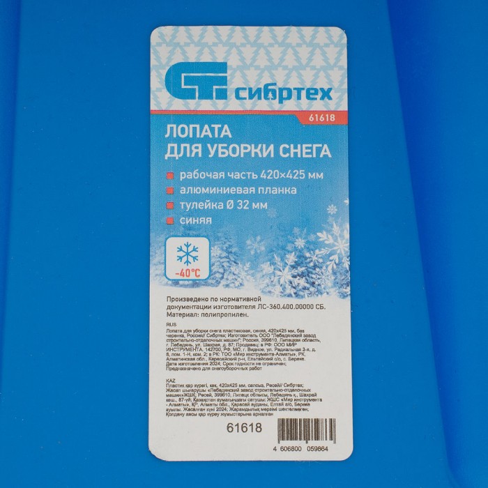 Лопата для уборки снега пластиковая, синяя, 420 х 425 мм, без черенка, Сибртех (61618)