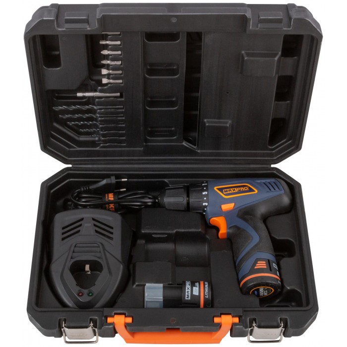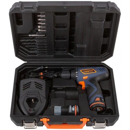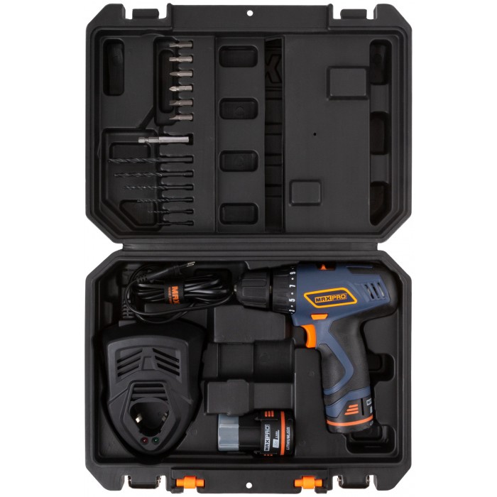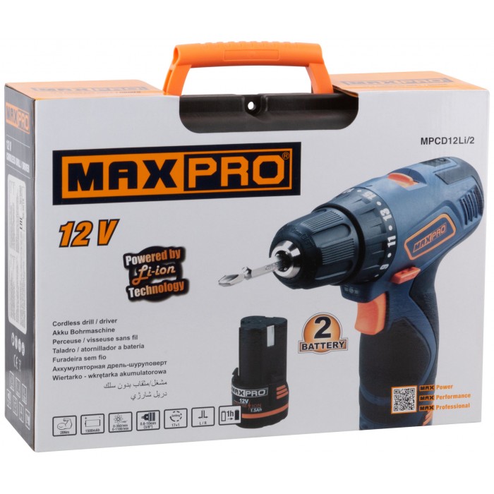 Дрель-шуруповерт аккумуляторная. 12 В; двухскоростной планетарный редуктор 0-350/0-1100 об/мин; быстрозажимной патрон 10 мм; максимальный крутящий момент 30 Нм; 2 батареи (SAMSUNG Li-Ion) х 1,5 Ач; регулировка крутящего момента 17+1; быстрая зарядка батареи 1 ч.; регулировка частоты вращения; резиновые вставки; LED подсветка; LED индикатор заряда; 1 кг; кейс. (MPCD12Li/2) 12 В