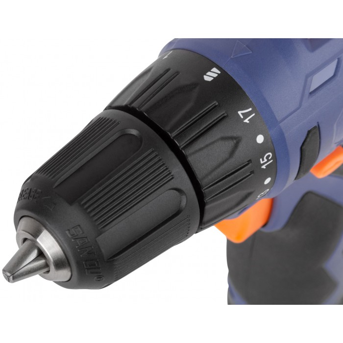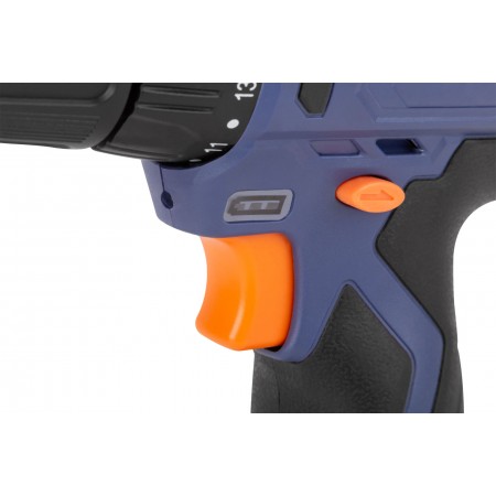 Дрель-шуруповерт аккумуляторная. 12 В; двухскоростной планетарный редуктор 0-350/0-1300 об/мин; быстрозажимной патрон 10 мм; максимальный крутящий момент 26 Нм. 2 батареи (Li-Ion) х 1,3 Ач; регулировка крутящего момента 17+1; быстрая зарядка батареи 1 ч.; регулировка частоты вращения; реверс; резиновые вставки; LED подсветка; 1 кг; кейс.