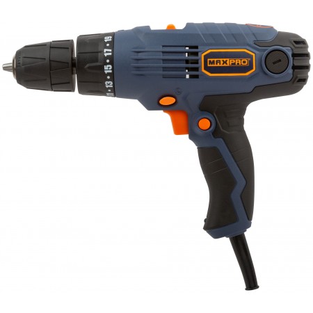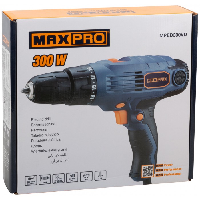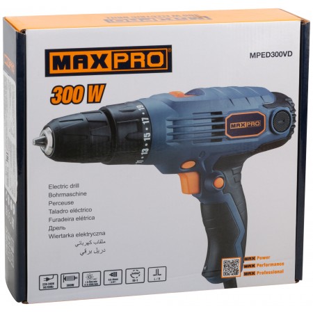 Дрель-шуруповерт электрическая 300 Вт; двухскоростной редуктор 0-450/0-1350 об/мин; быстрозажимной патрон 10 мм; максимальный крутящий момент 24 Нм; регулировка крутящего момента 19+1; реверс; резиновые вставки; быстрый доступ к щеткам; 1,3 кг; коробка.