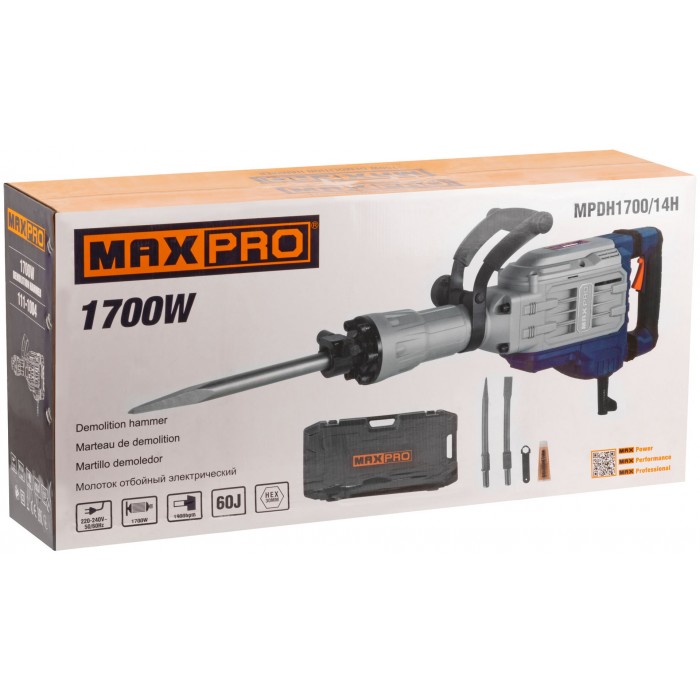 Молоток отбойный электрический, 1700 Вт, 1900 уд/мин, 60 Дж, 30 мм HEX, 14 кг, резиновый кабель, дополнительные щетки, кейс, MAX-PRO, 85107
