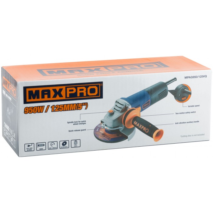 Шлифмашина угловая, 950 Вт, 3000-11000 об/мин, быстрозажимной кожух 125 мм, регулировка оборотов, антивибрационная ручка, дополнительные щетки, MAX-PRO, 85132