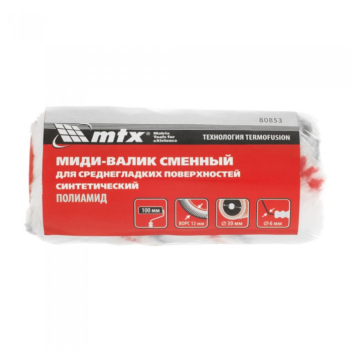 Миди-валик сменный для среднегладких поверхностей синтетический, 100 мм, ворс 12 мм, D 30 мм, D ручки 6 мм, полиамид MTX (80853)