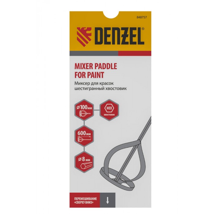 Миксер для красок, 100 х 8 х 600 мм, шестигранный хвостовик Denzel (848757)