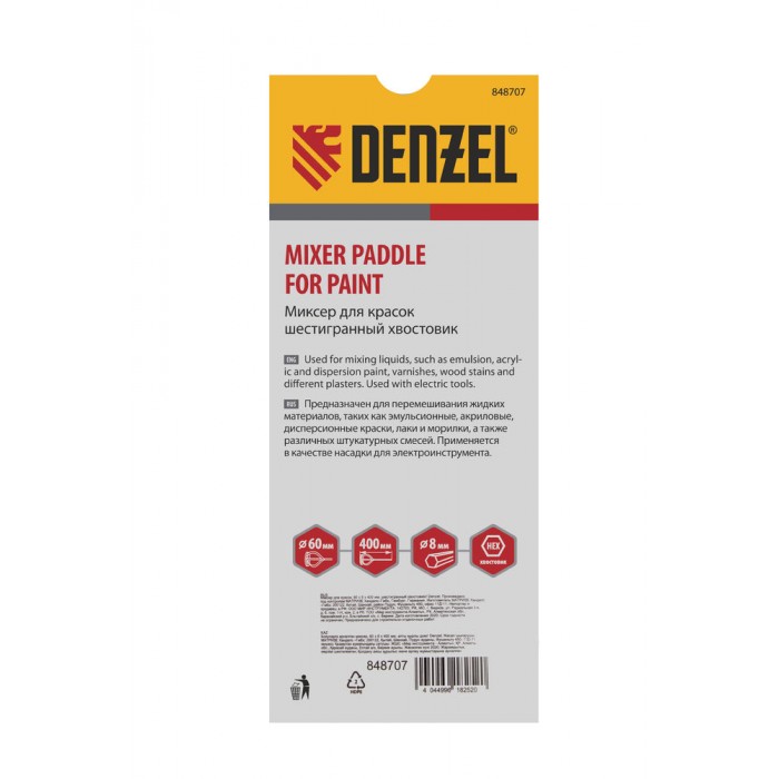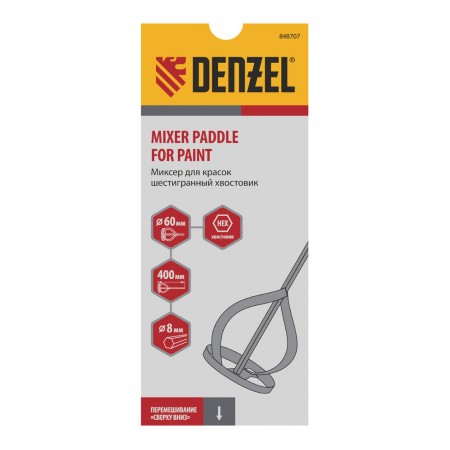 Миксер для красок, 60 х 8 х 400 мм, шестигранный хвостовик Denzel (848707)