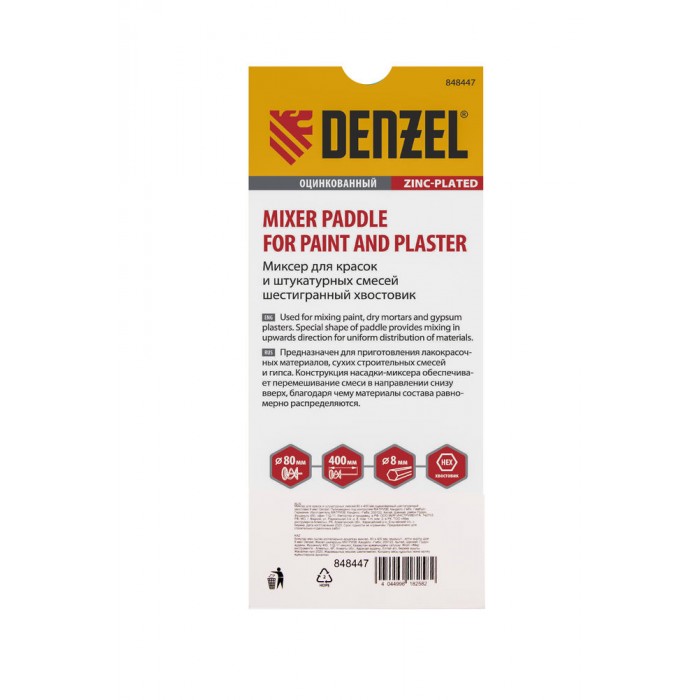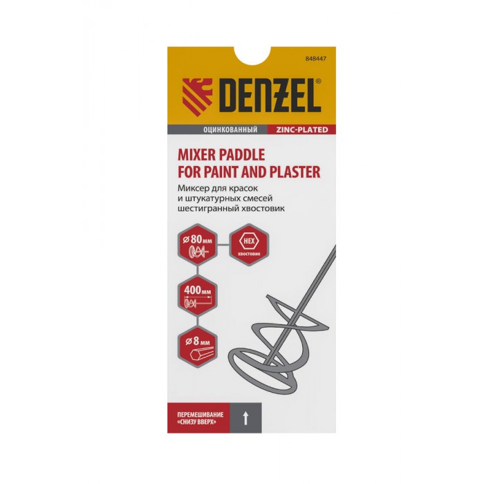 Миксер для красок и штукатурных смесей, 80 х 400 мм, оцинкованный, шестигранный хвостовик 8 мм Denzel (848447)