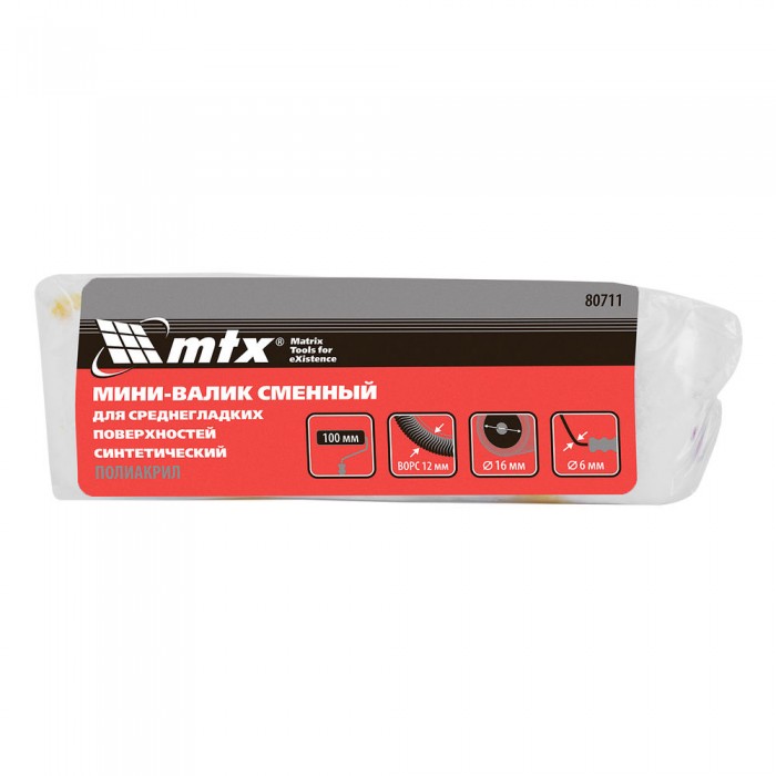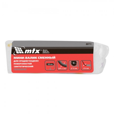 Мини-валик сменный для среднегладких поверхностей синтетический, 100 мм, ворс 12 мм, D 16 мм, D ручки 6 мм, полиакрил MTX (80711)