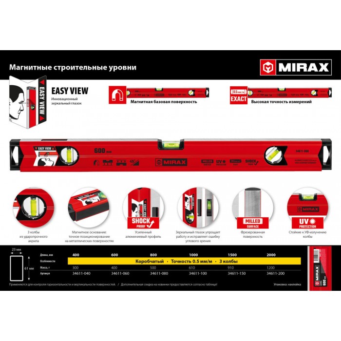 Магнитный уровень 1000 мм, с зеркальным глазком MIRAX 34611-100