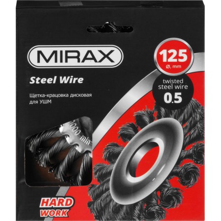 Все изготавливаемые щетки MIRAX соответствуют действующим стандартам качества и обеспечивают безопасную работу в указанном диапазоне оборотов. Применяются на УШМ для зачистки поверхностей в труднодоступных местах от лакокрасочных покрытий, ржавчины, окалины, различных загрязнений с применением значительных усилий, а также для зачистки сварных швов.