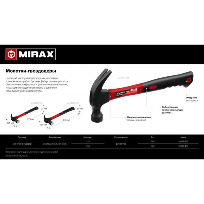 Молоток-гвоздодёр столярный 450 г с фиберглассовой рукояткой MIRAX 20231-450