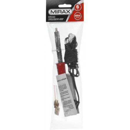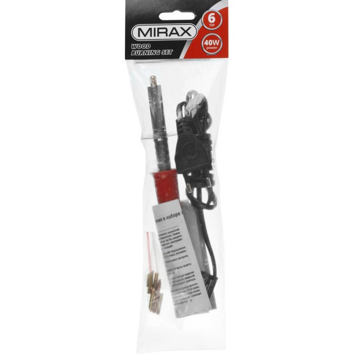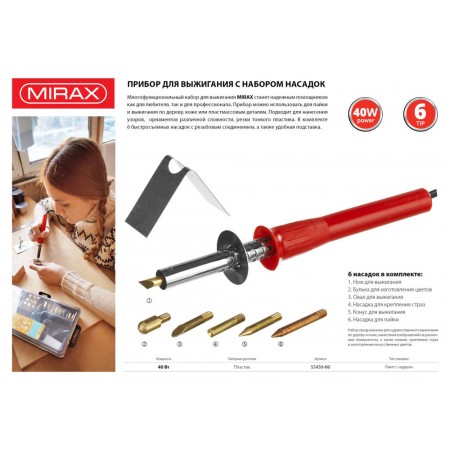Прибор для выжигания с набором насадок 6 шт. MIRAX 55430-H6 используется для декоративных работ, художественного оформления деревянных заготовок. Комплектуется шестью насадками(1.Для пайки, 2.Конус для выжигпания,3 Нож для выжигания, 4.Булька для изготовления цветов, 5. Овал для выжигания, 6.Для крепления страз). Сменные насадки, делают прибор универсальным.
