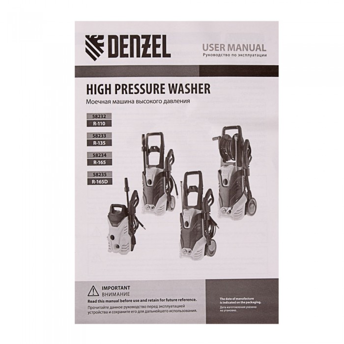 Моечная машина высокого давления R-165, 2200 Вт, 165 бар, 7 л/мин, колесная Denzel (58234)