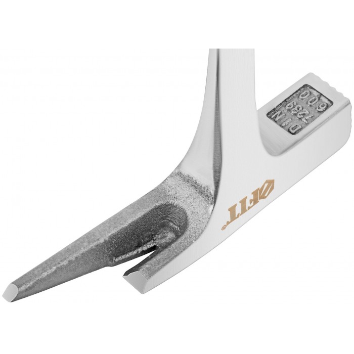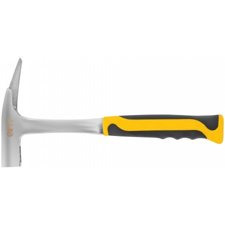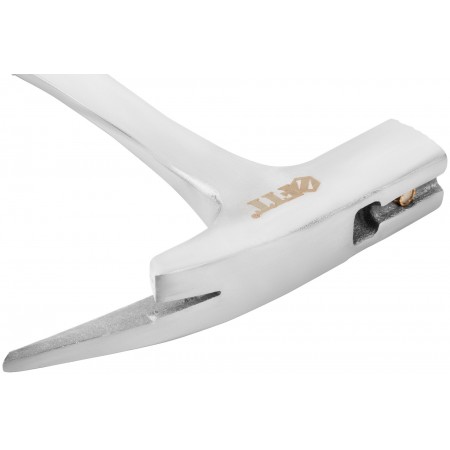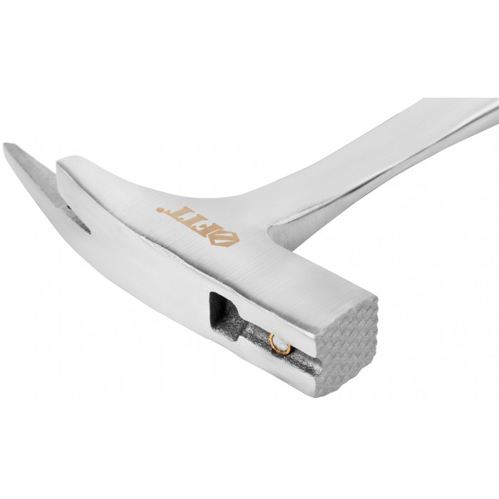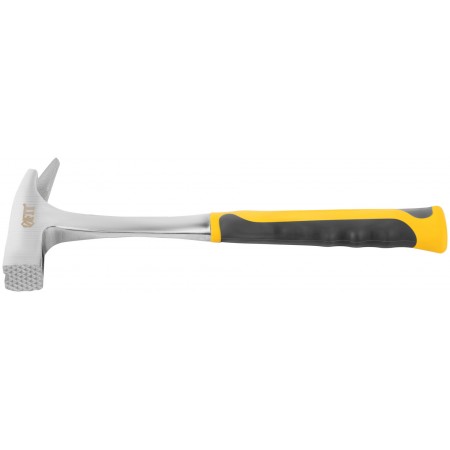 Цельнометаллический. Выемка с магнитом для удержания гвоздей. Для работы с кровлей из листовой стали. Материал: кованая термообработанная полированная инструментальная сталь, ручка с мягким прорезиненным покрытием.