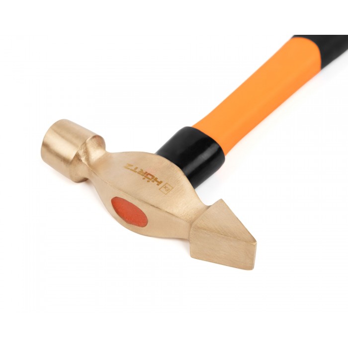Молоток слесарный с фиберглассовой рукоятью искробезопасный HORTZ, Выполнен из специального сплава, изделия из которого не высекают искр при ударах. Используется для забивания гвоздей или разбивания разнообразных предметов при различных слесарных работах в потенциально взрывоопасных зонах — зонах повышенной опасности возникновения взрыва или возгорания вследствие появления искры. Боек имеет квадратную форму и отличается повышенной прочностью. Эргономичная фибергласовая рукоятка с прорезиненным основанием гарантирует надежный хват и не скользит в руках при работе. Изготавливается в двух вариантах сплавов: алюминиевая бронза и бериллиевая бронза (AL-Cu & Be-Cu). Высокая прочность, высокое качество. Сертифицирован в соответствии со стандартами взрывобезопасности ТР ТС 012/2011.