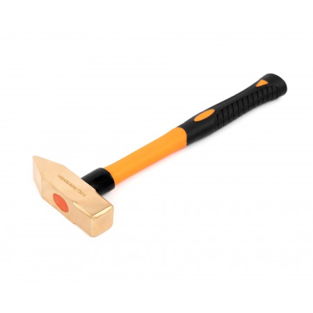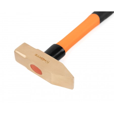 Молоток слесарный с фиберглассовой рукоятью искробезопасный HORTZ, Выполнен из специального сплава, изделия из которого не высекают искр при ударах. Используется для забивания гвоздей или разбивания разнообразных предметов при различных слесарных работах в потенциально взрывоопасных зонах — зонах повышенной опасности возникновения взрыва или возгорания вследствие появления искры. Боек имеет квадратную форму и отличается повышенной прочностью. Эргономичная фибергласовая рукоятка с прорезиненным основанием гарантирует надежный хват и не скользит в руках при работе. Изготавливается в двух вариантах сплавов: алюминиевая бронза и бериллиевая бронза (AL-Cu & Be-Cu). Высокая прочность, высокое качество. Сертифицирован в соответствии со стандартами взрывобезопасности ТР ТС 012/2011.