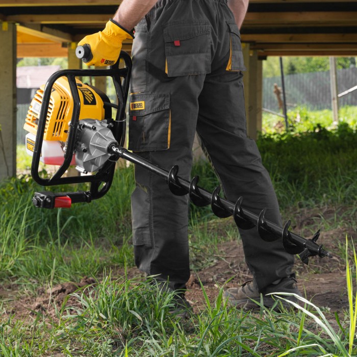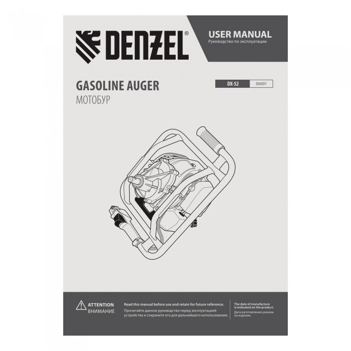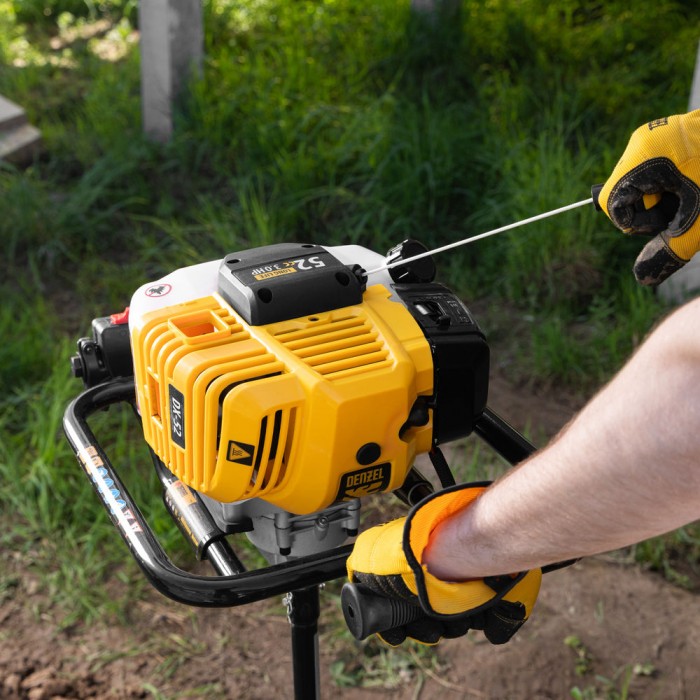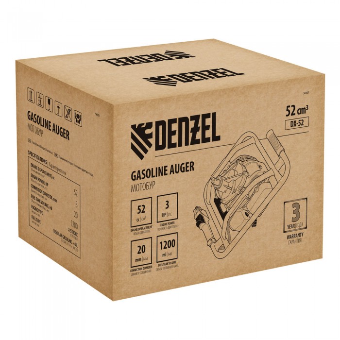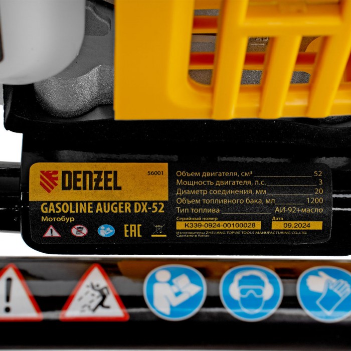 Мотобур DX-52, объем двигателя 52 см3, соединение 20 мм, без шнека Denzel (56001)