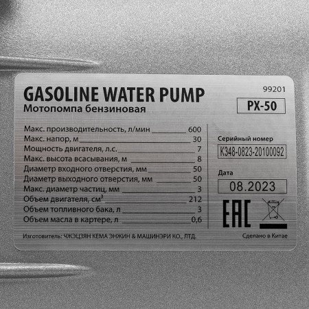 Мотопомпа бензиновая для чистой воды PX-50, 7 л.с, 2", 600 л/мин, глубина 8 м, напор 30 м Denzel (99201)