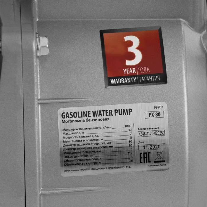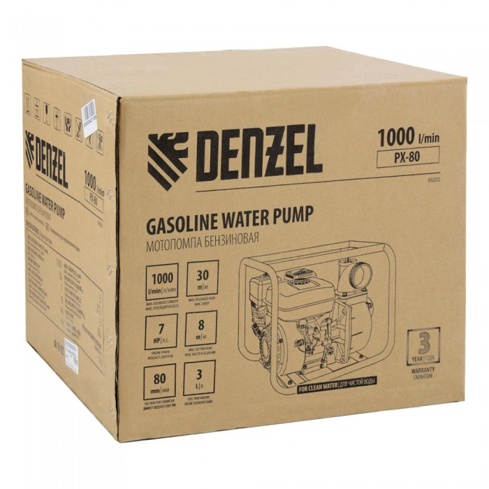 Мотопомпа бензиновая для чистой воды PX-80, 7 л.с, 3", 1000 л/мин, глубина 8 м, напор 30 м Denzel (99202)