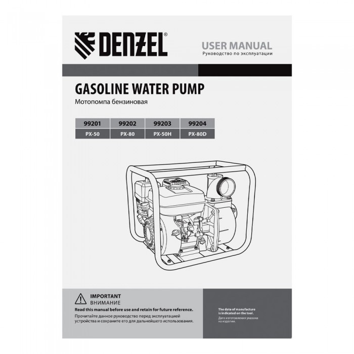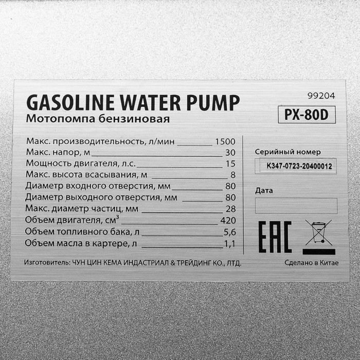 Мотопомпа бензиновая для грязной воды PX-80D, 15 л.с, 3", 1500 л/мин, глубина 8 м , напор 30 м Denzel (99204)