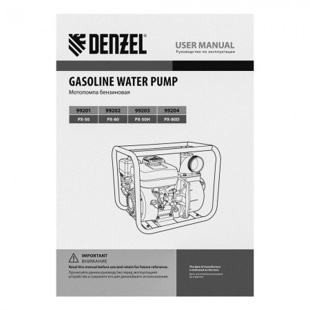 Мотопомпа бензиновая высоконапорная PX-50H, 7 л.с, 2", 600 л/мин, глубина 8 м, напор 65 м Denzel (99203)