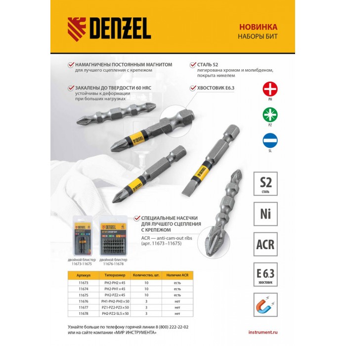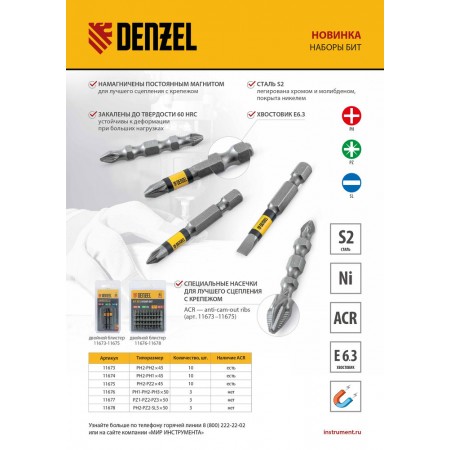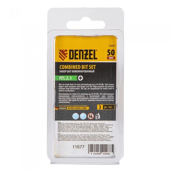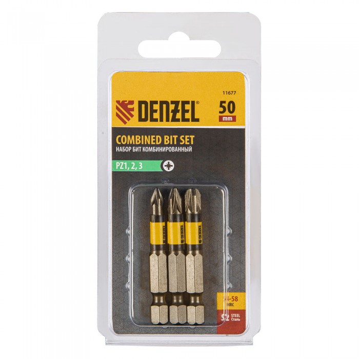 Набор бит комбинированный 3 шт., PZ1, PZ2, PZ3, 50 мм, сталь S2 Denzel (11677)
