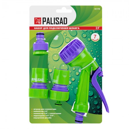 Набор для подключения шланга 3/4, пистолет 7 режимов полива, адаптер, 2 соединителя Palisad (65178)