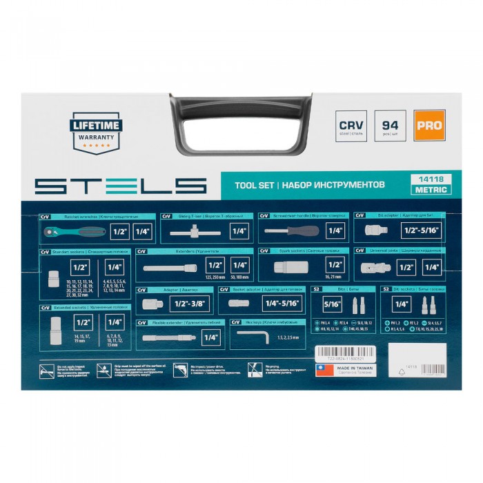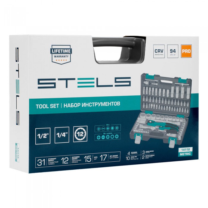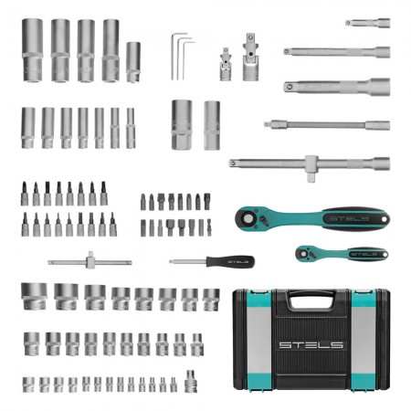 Набор инструментов 1/2", 1/4", CrV, 12 гранные головки, пластиковый кейс, 94 предмета Stels