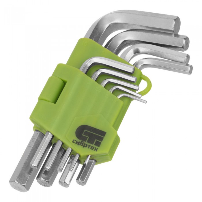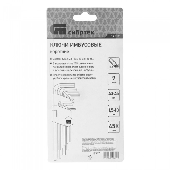 Набор ключей имбусовых HEX, 1.5-10 мм, 45x, закаленные, 9 шт, короткие, никель Сибртех