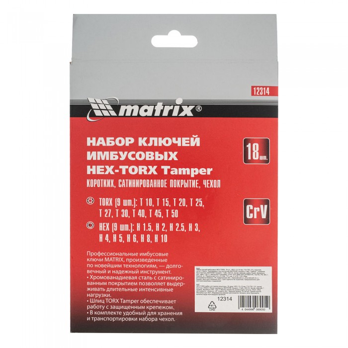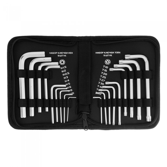 Набор ключей имбусовых HEX-Torx , 18 шт: HEX 1.5-10 мм, T10-T50, CrV, коротких, с сатиновым покрытием Matrix