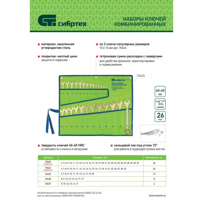 Набор ключей комбинированный 6-32 мм, 26 шт, желтый цинк Сибртех (15445)