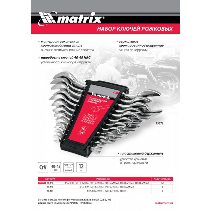 Набор ключей рожковых, 6 х 32 мм, 12 шт., CrV, хромированные Matrix (15278)