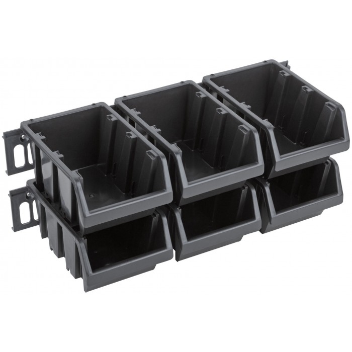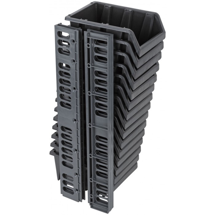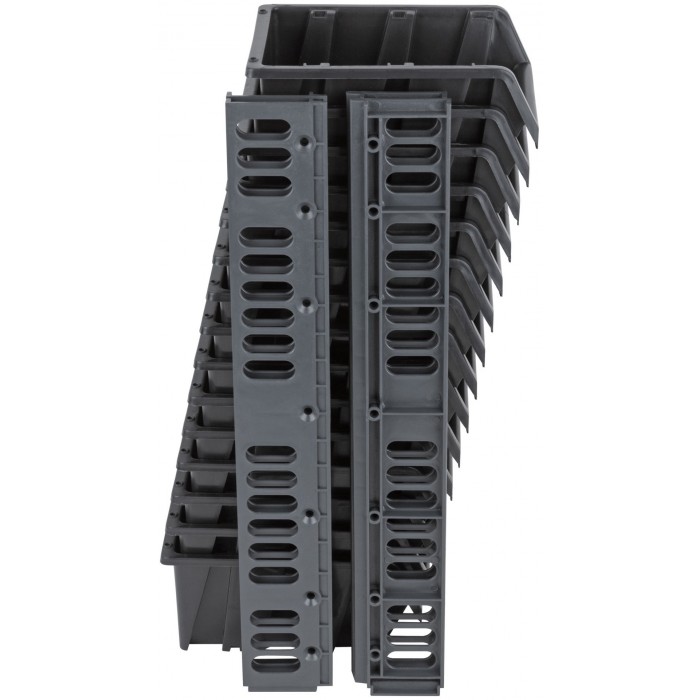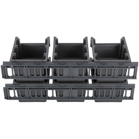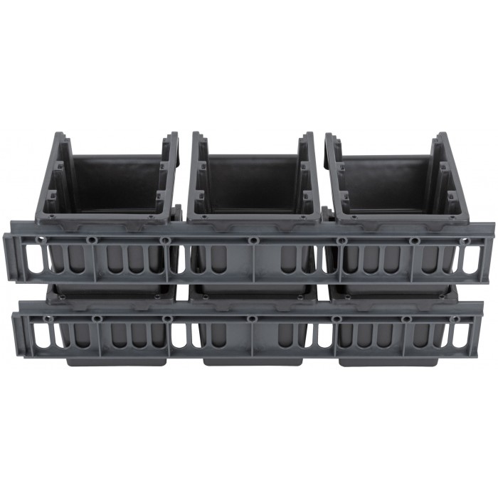 Используется для навешивания лотков и органайзеров с метизами и небольшими инструментами. Имеет возможность соединения нескольких лотков одинаковых размеров, а также размещения лотков на планке-держателе (по 3-4 лотка на планку), входящей в набор. В комплекте 15 лотков и 4 планки. Материал: пластик.