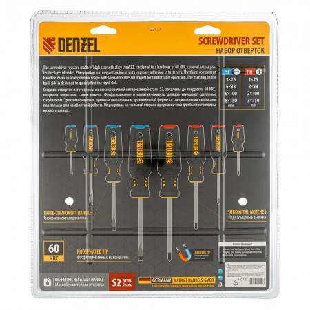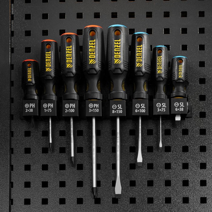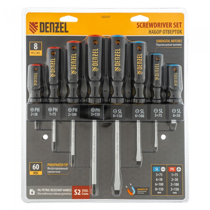 Набор отверток на полке, 8 шт., PH+SL, S2, 3к рукоятка Denzel (122137)