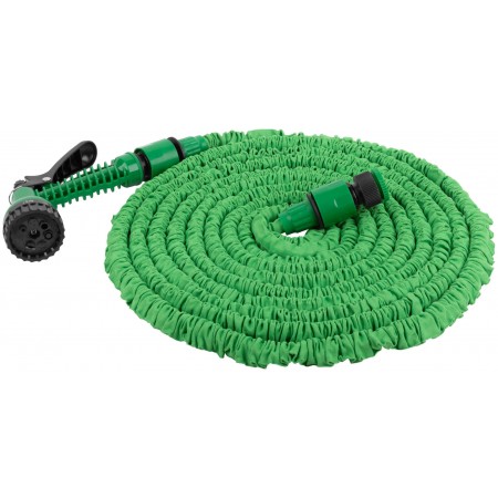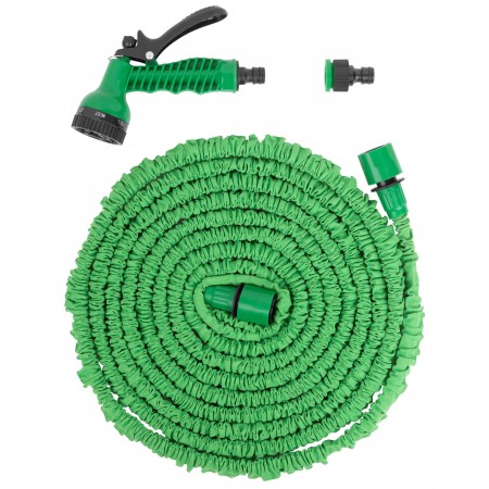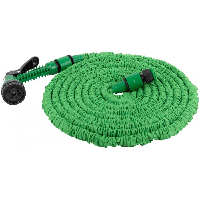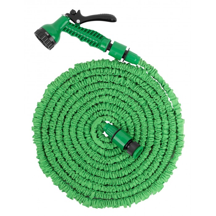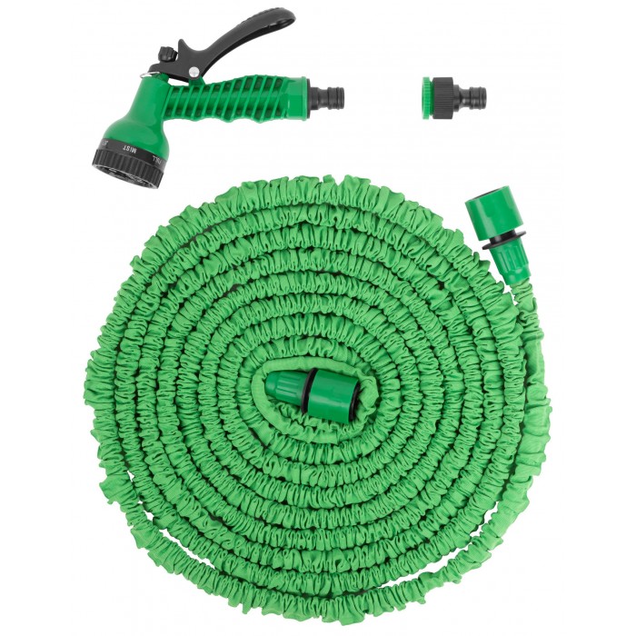 Для полива и орошения почвы. В наборе: шланг поливочный, способный удлиняться в три раза и возвращаться после полива в исходную длину; пистолет-распылитель с 7 режимами распыления и скобой-фиксатором для непрерывной подачи воды; адаптер внешний с переходником для подключения к трубам и кранам с внешней резьбой 1/2'' и 3/4''; быстросъемные соединители поливочной системы на обоих концах шланга. Материал: шланг из термополиэтилена и полиэстера; быстросъемные соединители, адаптер внешний, курок пистолета и переключатель режимов пистолета из пластика; корпус пистолета из ударопрочного ABS пластика. Упаковка: картонная коробка.