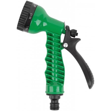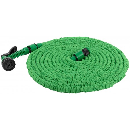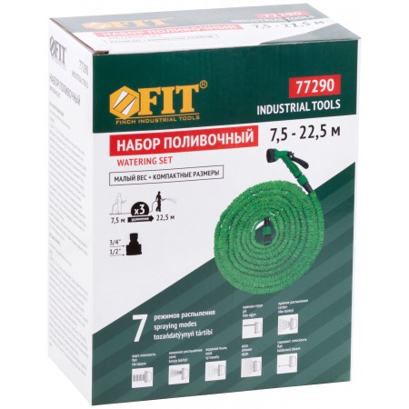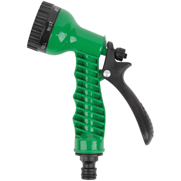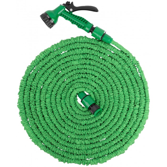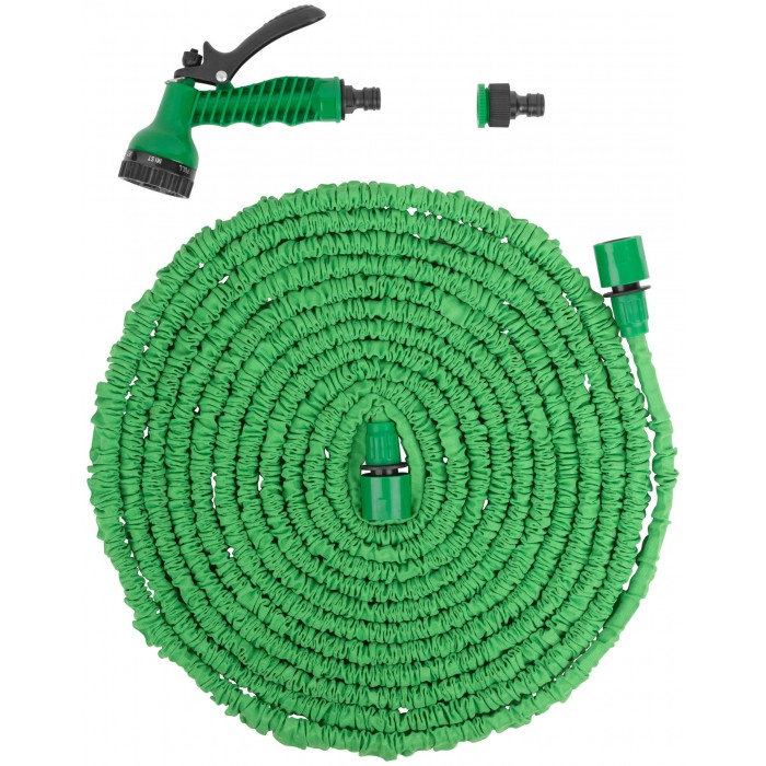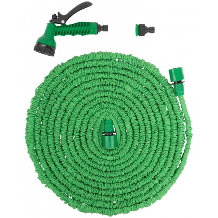 Для полива и орошения почвы. В наборе: шланг поливочный, способный удлиняться в три раза и возвращаться после полива в исходную длину; пистолет-распылитель с 7 режимами распыления и скобой-фиксатором для непрерывной подачи воды; адаптер внешний с переходником для подключения к трубам и кранам с внешней резьбой 1/2'' и 3/4''; быстросъемные соединители поливочной системы на обоих концах шланга. Материал: шланг из термополиэтилена и полиэстера; быстросъемные соединители, адаптер внешний, курок пистолета и переключатель режимов пистолета из пластика; корпус пистолета из ударопрочного ABS пластика. Упаковка: картонная коробка.