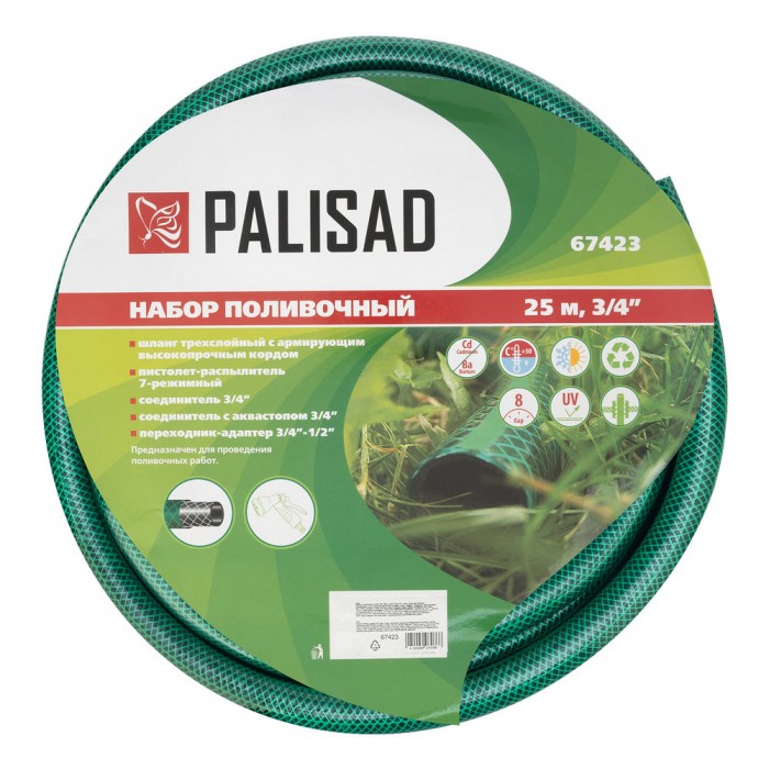 Набор поливочный, шланг 3/4", 25 м, 7 режимов пистолет, соединитель, адаптер Palisad (67423)