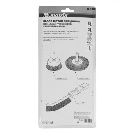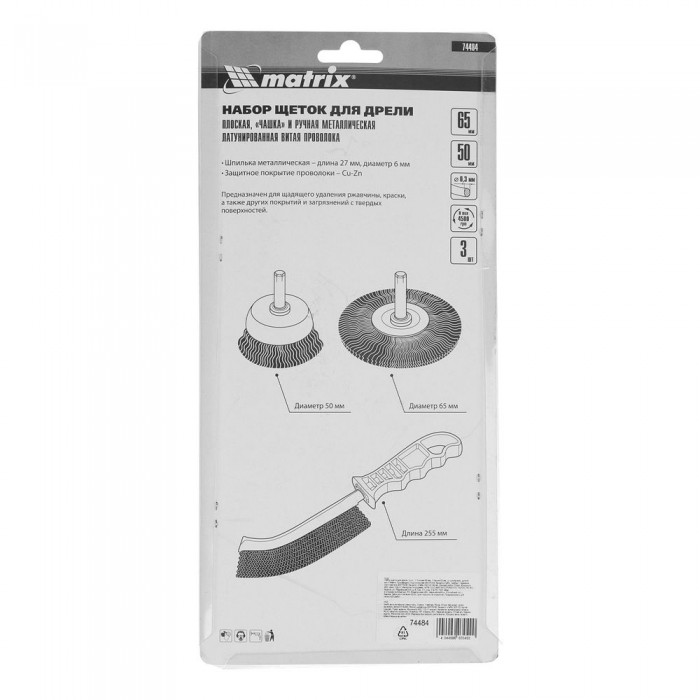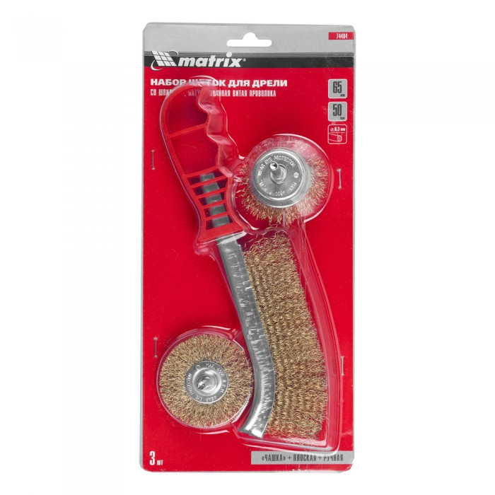 Набор щеток для дрели, 3 шт, 1 плоская, 65 мм, 50 мм "чашка", ручная металлическая Matrix (74484)