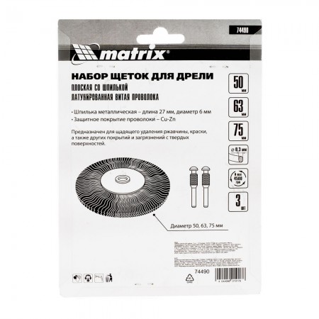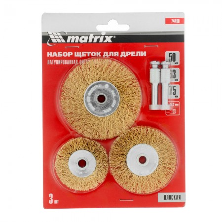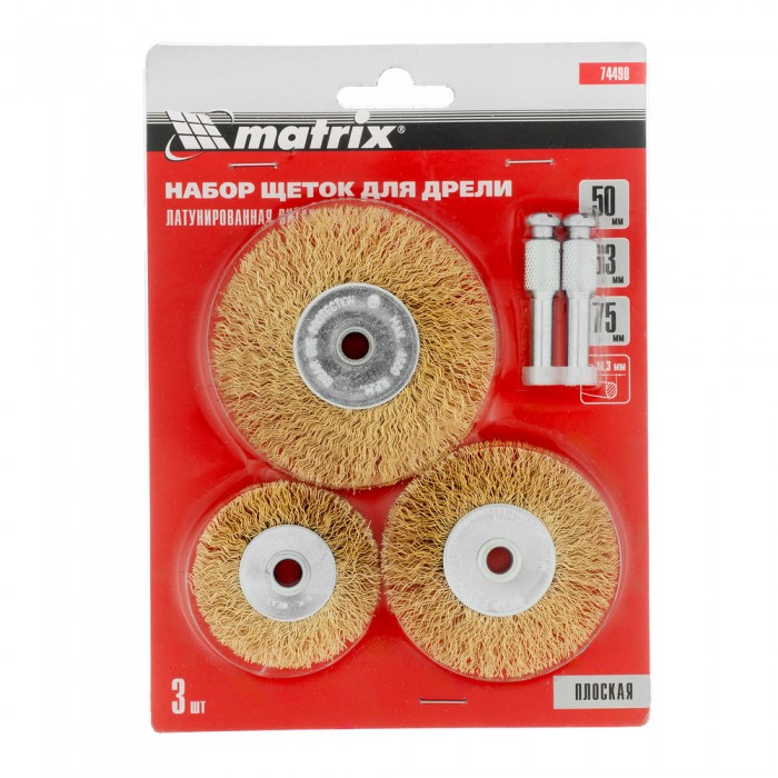 Набор щеток для дрели, 3 шт, 3 плоские, 50-63-75 мм, со шпильками, металлические Matrix (74490)